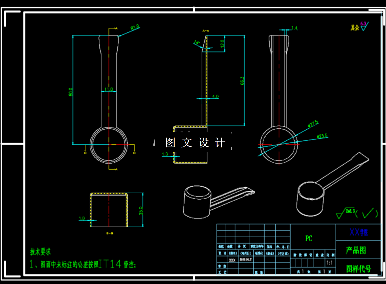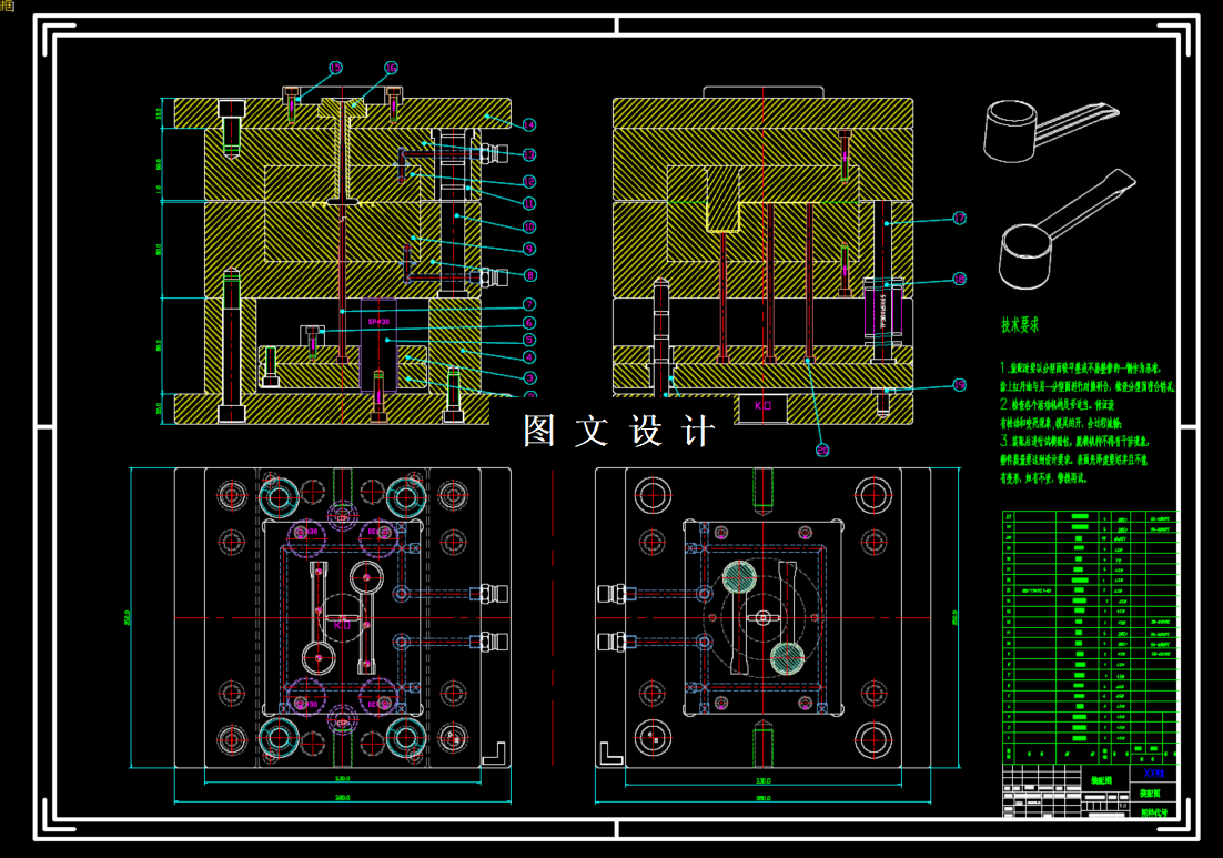 该塑件为勺子,表面光滑,在模具设计和制造上要有良好的加工工艺,确保成型零件具有一定的光洁度;考虑到生产的要求,我们采用一模两腔,侧进胶 顶针顶出,两板模 单分型面的设计方案,比较有参考价值。