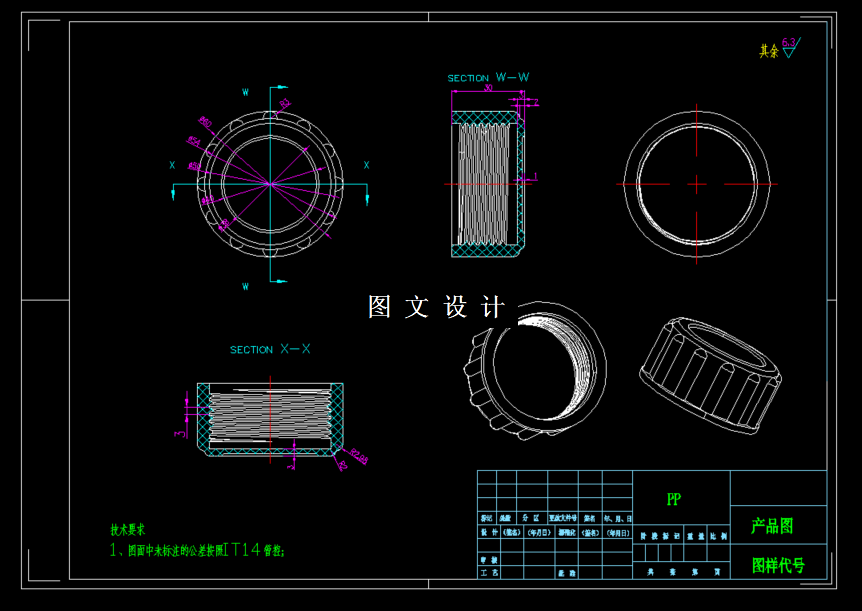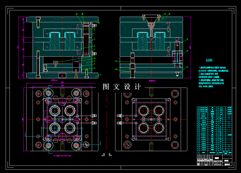 花边塑料盖注塑模具设计图纸-一模四腔 ,首先对花边塑料盖结构进行了工艺分析,采用PP塑件作为材料。根据制件所用材料的工艺性能,选择注射机。再根据制件质量要求及外形特点选取标准模架,将已经测得的花边塑料盖各部位尺寸代入公式进一步确定各零件的尺寸,进一步设计型腔、型芯、浇注系统、脱模系统等。接着对模具的材料进行了选择,以便设计出的结构可确保模具工作运行可靠。