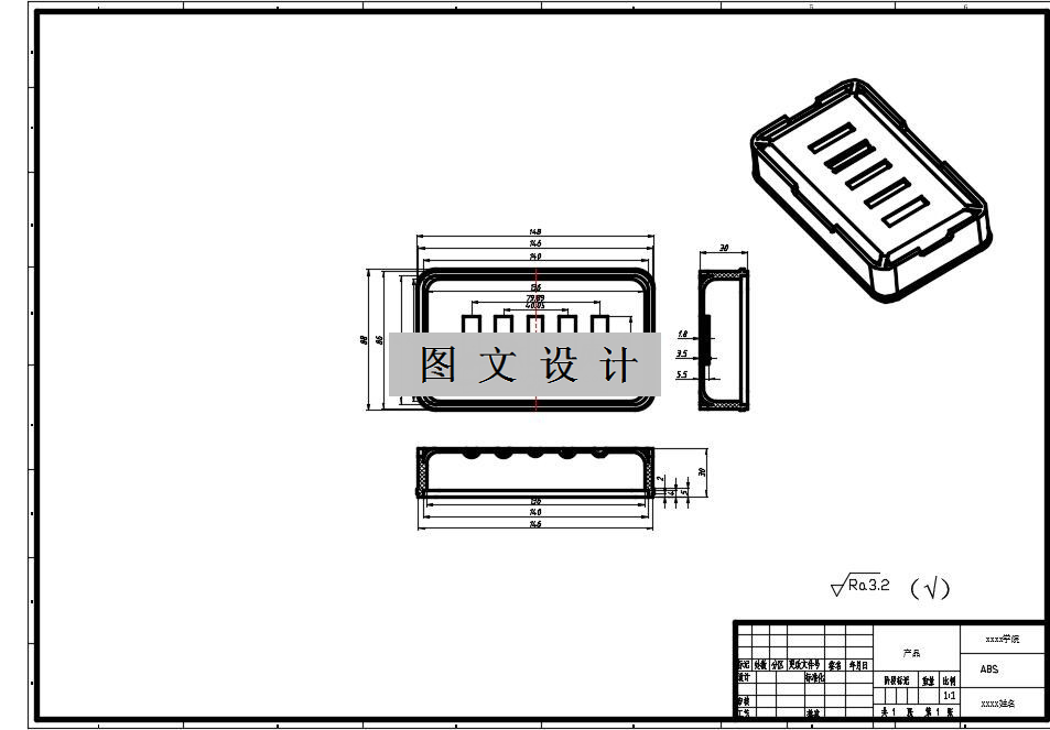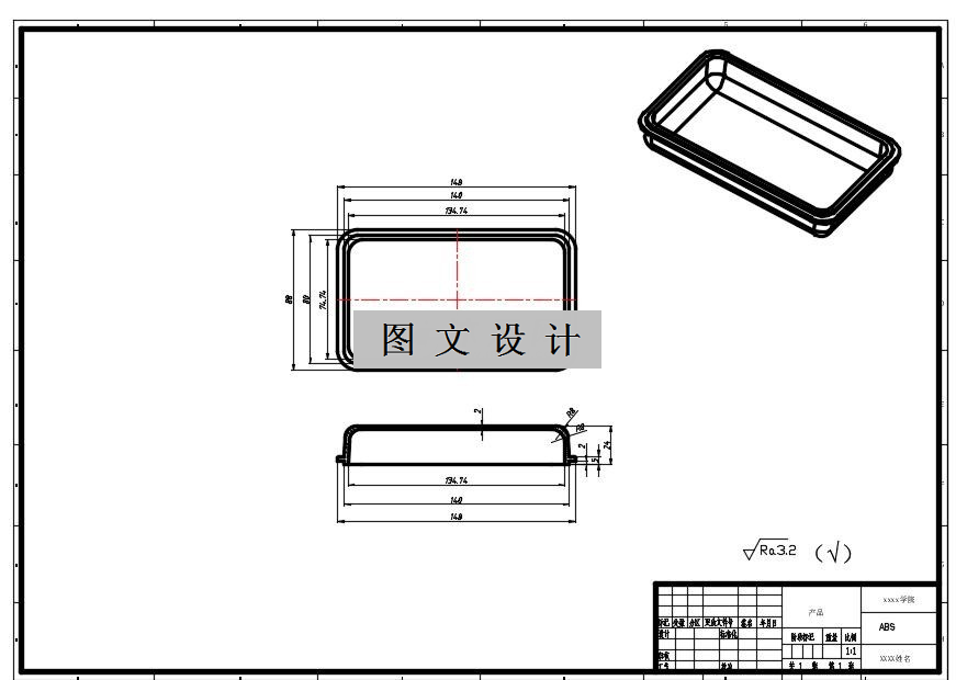 塑料制品外形尺寸的大小主要取决于塑料品种的流动性和注射机规格,在一定的设备和工艺条件下流动性好的塑料可以成型较大尺寸的制品,反之成型出的制品尺寸就比较小。从节约材料和能源的角度出发,只要能满足制品的使用要求,一般都应将制品的结构设计的尽量紧凑,以便使制品的外形尺寸玲珑小巧些。该塑件的材料为ABS,流动性较差,适用于尺寸较小的制品。 塑件的尺寸精度直接影响模具结构的设计和模具的制造精度。为降低模具的加工难度和模具的制造成本,在满足塑件要求的前提下尽量把塑件的尺寸精度设计得低一些。由于塑料与金属的差异很大,所以不能按照金属零件的公关等级确定精度等级。根据我国目前的成型水平,塑件尺寸公差可以参照一些课外的参考文献。根据本次毕业设计的具体要求,该产品尺寸可采用MT5级精度,未注采用MT5级精度。