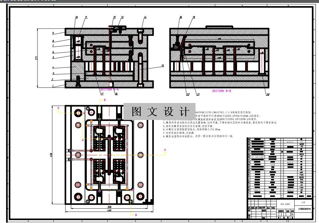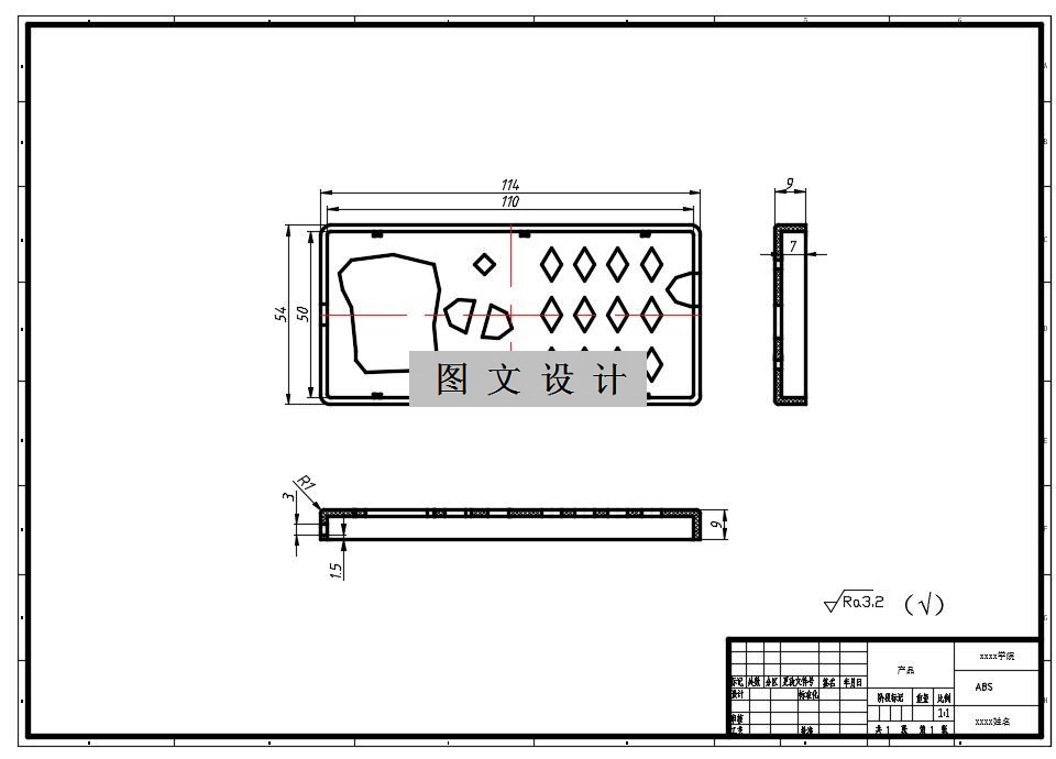 设计分型面选在截面最大处,由于产品有内孔,所以模具结构要用侧抽芯,浇口采用侧浇口,塑件成型后利用推板将成型制品从动模上推出。 设计中需要对塑件的尺寸进行计算,确定尺寸精度,然后进行注射机的选取。对注射机参数进行校核,包括模具闭合厚度、模具安装尺寸、模具开模行程、注射机的锁模力等。各个参数都满足要求后才能确定注射机的型号。 在设计过程中,为了更清楚的表达模具的内部结构,因此附有大量的模具结构图和模具局部图,并通过通过CAD出它的二维图。