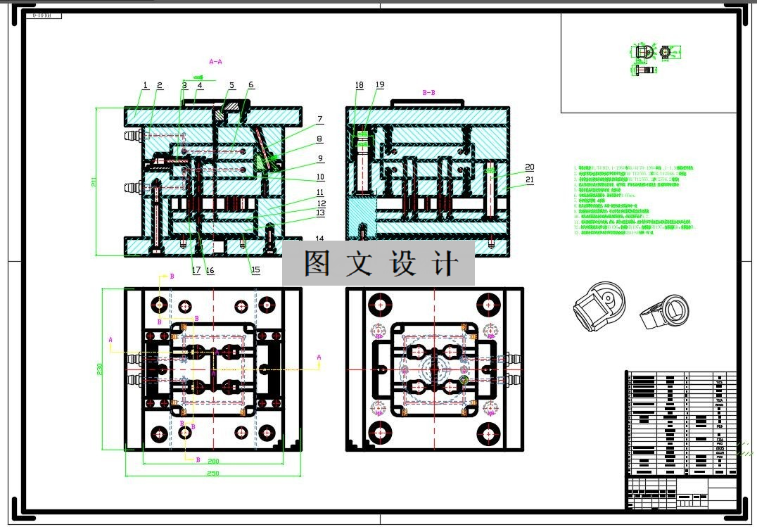 在本设计中进行了塑件工艺性分析、总体方案的设计、注塑机的选择、浇注系统的设计、成型零件的设计、脱模机构的设计、侧抽芯机构的设计及计算、导向和定位机构的设计、模架的选择、冷却系统的设计和计算等设计工作。在本次设计中,需要加工的工件有侧孔,采用了一个由侧型芯、固定件、挡块组成的侧抽芯机构,避免了采用斜导柱结构。