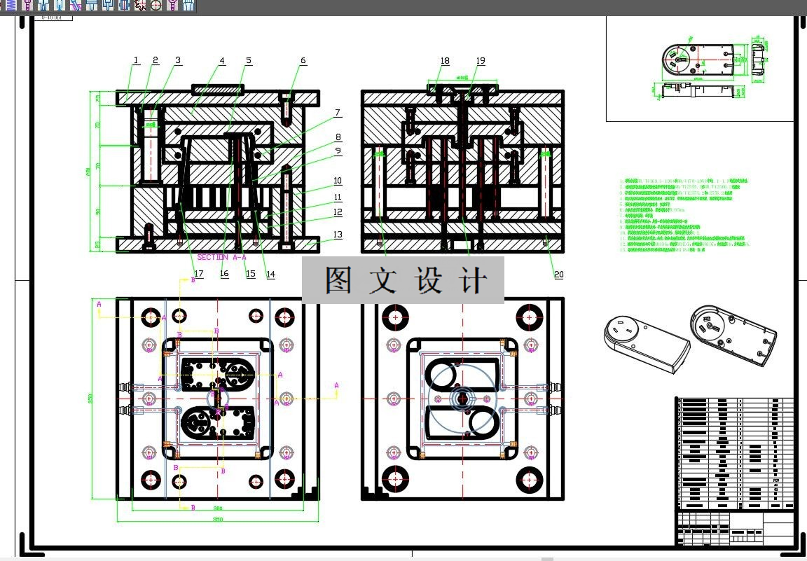 本次设计的主要内容:注射机的选型及工艺参数的确定,浇注系统、成型零部件、冷却系统、脱模机构等的设计以及最后对该模具进行简单的分析等。全套设计有模具三维,cad全套图纸。