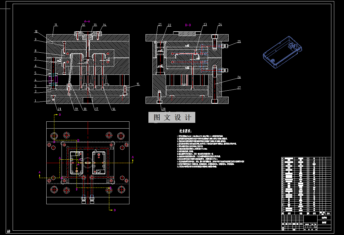 模具为一模两腔,侧浇口,塑件上内侧凹结构采用斜推杆抽芯机构成型,本资料含有模具装配图、模具三维、多张模具零件图