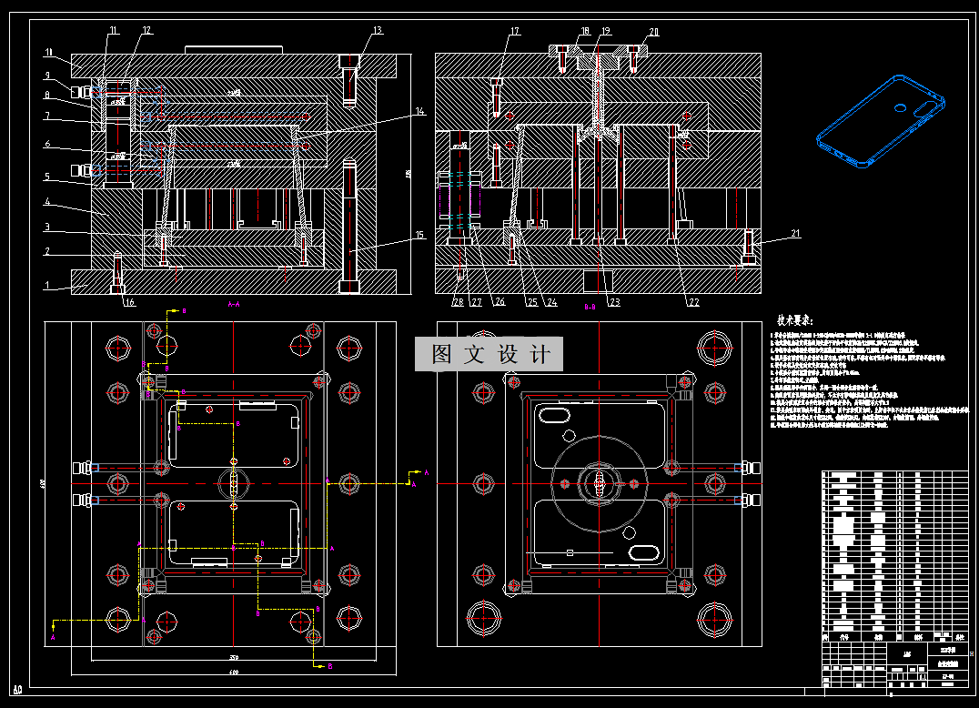 参考资料小米8手机保护壳注塑模具设计主题。模具为一模两腔,潜顶杆式浇口,塑件上侧凹结构采用内侧斜顶杆抽芯机构成型,本资料含有模具装配图、模具三维、多张模具零件图