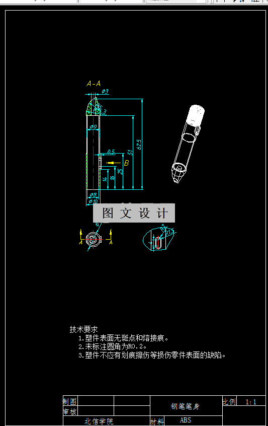 参考资料钢笔笔身注塑模具设计主题。模具为一模两腔,侧浇口,塑件上中空结构采用斜导柱抽芯机构成型,本资料含有模具装配图、模具三维、多张模具零件图