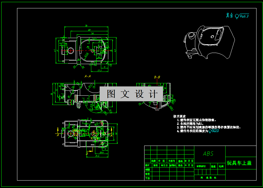 本设计是注塑模具设计为主题。其设计思路由参考多个生产事例而得出,设计内容是从零件的工艺分析开始的,根据工艺要求来确定设计的大体思路。