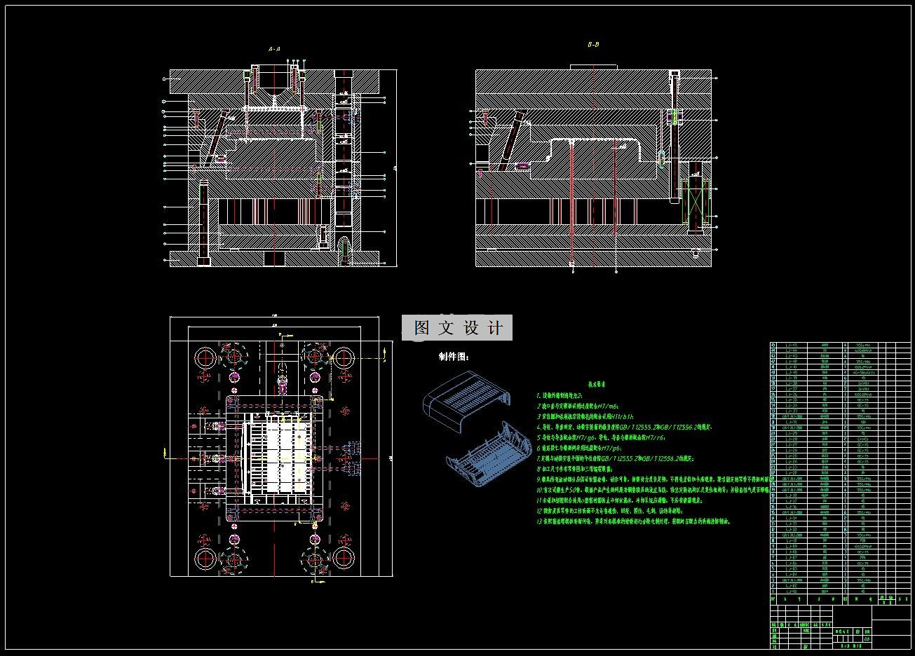 本设计是注塑模具设计为主题。其设计思路由参考多个生产事例而得出,设计内容是从零件的工艺分析开始的,根据工艺要求来确定设计的大体思路。在设计当中,很多东西都是自己原来所没有接触过的,尤其是前段时间所学的理论课知识与现在的自己动手操作设计,设计顺序开始是从零件的材料选择,接下是成型参数、密度、收缩率的确定,模具种类与模具设计的关系、塑件的尺寸精度与结构、注射机的选择、模具设计有关尺寸的计算(包括模具型腔型芯的计算及其公差的确定)、注塑机参数的校核、模具结构设计、模具冷却、加热系统计算、注射模标准件的选用及总装技术要求等内容。 其次是模具的结构,在模具结构的设计当中,首先设计的是模具的型腔结构,接下来是型芯结构、斜导柱、滑块、导向机构、复位杆、拉料杆、推件杆和推出机构,这样做的目的是为了规范化,更重要的是为了以后与制造人员的配合。既让自己有了良好的设计习惯,又能锻炼自己的配合意识。为以后工作做一次演练,这样更能体现理论与实践相结合的目的