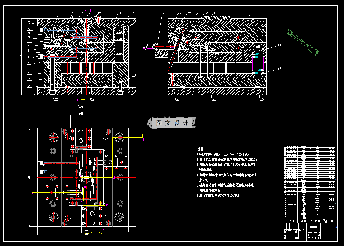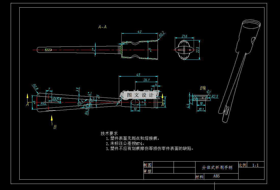 本设计是注塑模具设计为主题。其设计思路由参考多个生产事例而得出,设计内容是从零件的工艺分析开始的,根据工艺要求来确定设计的大体思路。在设计当中,很多东西都是自己原来所没有接触过的,尤其是前段时间所学的理论课知识与现在的自己动手操作设计,设计顺序开始是从零件的材料选择,接下是成型参数、密度、收缩率的确定,模具种类与模具设计的关系、塑件的尺寸精度与结构、注射机的选择、模具设计有关尺寸的计算(包括模具型腔型芯的计算及其公差的确定)、注塑机参数的校核、模具结构设计、模具冷却、加热系统计算、注射模标准件的选用及总装技术要求等内容。 其次是模具的结构,在模具结构的设计当中,首先设计的是模具的型腔结构,接下来是型芯结构、斜导柱、滑块、导向机构、复位杆、拉料杆、推件杆和推出机构,这样做的目的是为了规范化,更重要的是为了以后与制造人员的配合。既让自己有了良好的设计习惯,又能锻炼自己的配合意识。为以后工作做一次演练,这样更能体现理论与实践相结合的目的