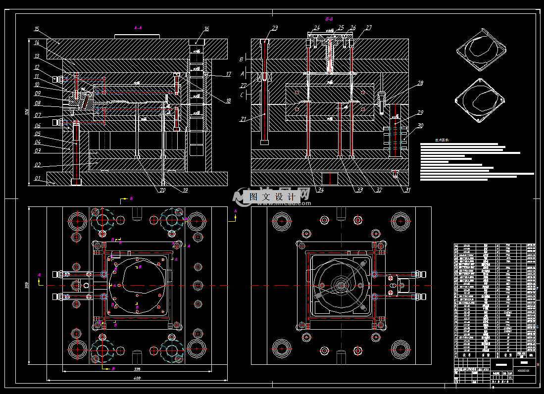 本设计是注塑模具设计为主题。其设计思路由参考多个生产事例而得出,设计内容是从零件的工艺分析开始的,根据工艺要求来确定设计的大体思路。在设计当中,很多东西都是自己原来所没有接触过的,尤其是前段时间所学的理论课知识与现在的自己动手操作设计,设计顺序开始是从零件的材料选择,接下是成型参数、密度、收缩率的确定,模具种类与模具设计的关系、塑件的尺寸精度与结构、注射机的选择、模具设计有关尺寸的计算(包括模具型腔型芯的计算及其公差的确定)、注塑机参数的校核、模具结构设计、模具冷却、加热系统计算、注射模标准件的选用及总装技术要求等内容。 其次是模具的结构,在模具结构的设计当中,首先设计的是模具的型腔结构,接下来是型芯结构、斜导柱、滑块、导向机构、复位杆、拉料杆、推件杆和推出机构,这样做的目的是为了规范化,更重要的是为了以后与制造人员的配合。既让自己有了良好的设计习惯,又能锻炼自己的配合意识。为以后工作做一次演练,这样更能体现理论与实践相结合的目的