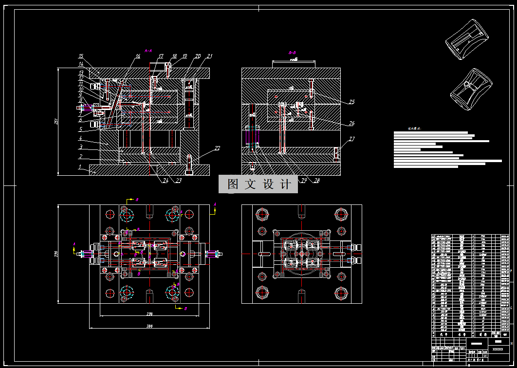 本设计是以“铅笔刀削笔刀外壳注塑模具设计”为主题。其设计思路由参考多个生产事例而得出,设计内容是从零件的工艺分析开始的,根据工艺要求来确定设计的大体思路。在设计当中,很多东西都是自己原来所没有接触过的,尤其是前段时间所学的理论课知识与现在的自己动手操作设计,设计顺序开始是从零件的材料选择,接下是成型参数、密度、收缩率的确定,模具种类与模具设计的关系、塑件的尺寸精度与结构、注射机的选择、模具设计有关尺寸的计算(包括模具型腔型芯的计算及其公差的确定)、注塑机参数的校核、模具结构设计、模具冷却、加热系统计算、注射模标准件的选用及总装技术要求等内容。 其次是模具的结构,在模具结构的设计当中,首先设计的是模具的型腔结构,接下来是型芯结构、斜导柱、滑块、导向机构、复位杆、拉料杆、推件杆和推出机构,这样做的目的是为了规范化,更重要的是为了以后与制造人员的配合。既让自己有了良好的设计习惯,又能锻炼自己的配合意识。为以后工作做一次演练,这样更能体现理论与实践相结合的目的