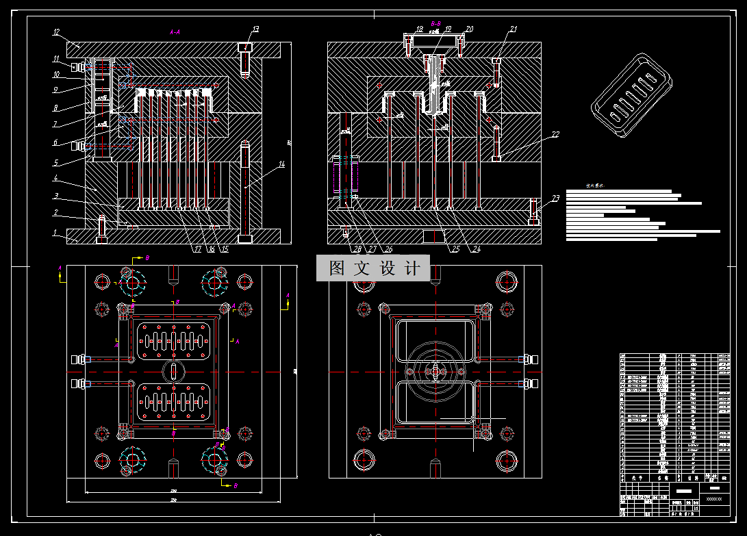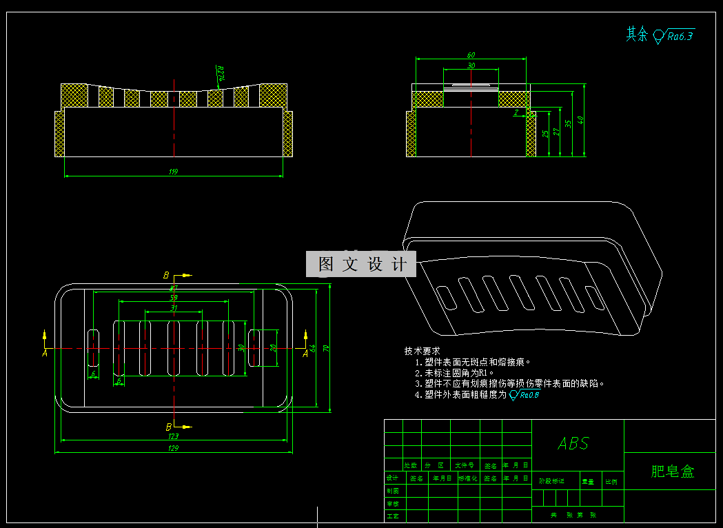 本设计是以“肥皂盒外壳注塑模具设计”为主题。其设计思路由参考多个生产事例而得出,设计内容是从零件的工艺分析开始的,根据工艺要求来确定设计的大体思路。在设计当中,很多东西都是自己原来所没有接触过的,尤其是前段时间所学的理论课知识与现在的自己动手操作设计,设计顺序开始是从零件的材料选择,接下是成型参数、密度、收缩率的确定,模具种类与模具设计的关系、塑件的尺寸精度与结构、注射机的选择、模具设计有关尺寸的计算(包括模具型腔型芯的计算及其公差的确定)、注塑机参数的校核、模具结构设计、模具冷却、加热系统计算、注射模标准件的选用及总装技术要求等内容。 其次是模具的结构,在模具结构的设计当中,首先设计的是模具的型腔结构,接下来是型芯结构、斜导柱、滑块、导向机构、复位杆、拉料杆、推件杆和推出机构,这样做的目的是为了规范化,更重要的是为了以后与制造人员的配合。既让自己有了良好的设计习惯,又能锻炼自己的配合意识。为以后工作做一次演练,这样更能体现理论与实践相结合的目的