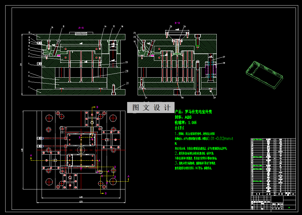 本设计是以“充电宝外壳注塑模具设计”为主题。其设计思路由参考多个生产事例而得出,设计内容是从零件的工艺分析开始的,根据工艺要求来确定设计的大体思路。在设计当中,很多东西都是自己原来所没有接触过的,尤其是前段时间所学的理论课知识与现在的自己动手操作设计,设计顺序开始是从零件的材料选择,接下是成型参数、密度、收缩率的确定,模具种类与模具设计的关系、塑件的尺寸精度与结构、注射机的选择、模具设计有关尺寸的计算(包括模具型腔型芯的计算及其公差的确定)、注塑机参数的校核、模具结构设计、模具冷却、加热系统计算、注射模标准件的选用及总装技术要求等内容。 其次是模具的结构,在模具结构的设计当中,首先设计的是模具的型腔结构,接下来是型芯结构、斜导柱、滑块、导向机构、复位杆、拉料杆、推件杆和推出机构,这样做的目的是为了规范化,更重要的是为了以后与制造人员的配合。既让自己有了良好的设计习惯,又能锻炼自己的配合意识。为以后工作做一次演练,这样更能体现理论与实践相结合的目的。