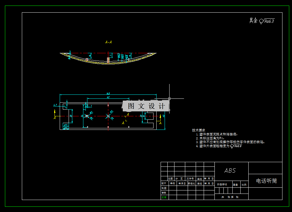 本设计是以“电话听筒注塑模具设计”为主题。其设计思路由参考多个生产事例而得出,设计内容是从零件的工艺分析开始的,根据工艺要求来确定设计的大体思路。在设计当中,很多东西都是自己原来所没有接触过的,尤其是前段时间所学的理论课知识与现在的自己动手操作设计,设计顺序开始是从零件的材料选择,接下是成型参数、密度、收缩率的确定,模具种类与模具设计的关系、塑件的尺寸精度与结构、注射机的选择、模具设计有关尺寸的计算(包括模具型腔型芯的计算及其公差的确定)、注塑机参数的校核、模具结构设计、模具冷却、加热系统计算、注射模标准件的选用及总装技术要求等内容。 其次是模具的结构,在模具结构的设计当中,首先设计的是模具的型腔结构,接下来是型芯结构、斜导柱、滑块、导向机构、复位杆、拉料杆、推件杆和推出机构,这样做的目的是为了规范化,更重要的是为了以后与制造人员的配合。既让自己有了良好的设计习惯,又能锻炼自己的配合意识。为以后工作做一次演练,这样更能体现理论与实践相结合的目的。