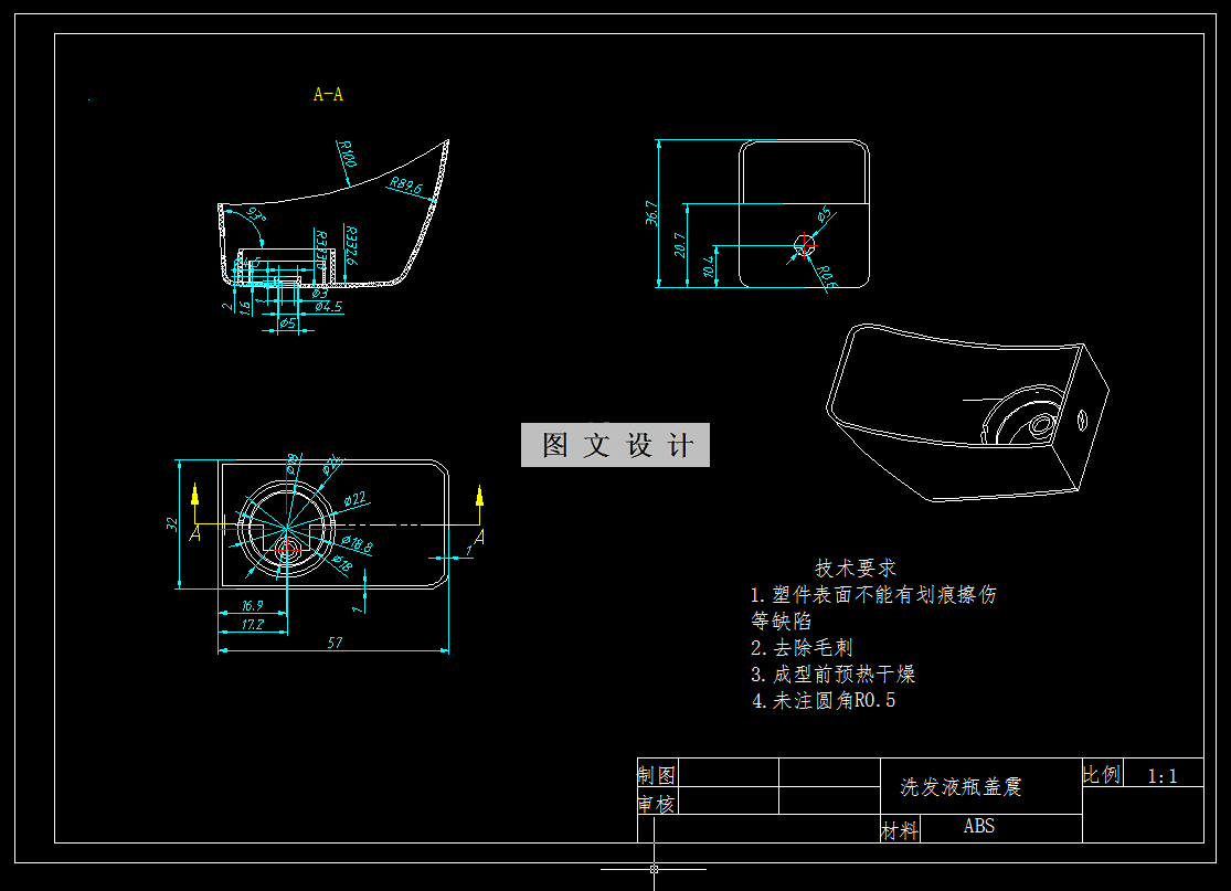 本设计是以“海飞丝洗发水瓶盖注塑模具设计”为主题。其设计思路由参考多个生产事例而得出,设计内容是从零件的工艺分析开始的,根据工艺要求来确定设计的大体思路。在设计当中,很多东西都是自己原来所没有接触过的,尤其是前段时间所学的理论课知识与现在的自己动手操作设计,设计顺序开始是从零件的材料选择,接下是成型参数、密度、收缩率的确定,模具种类与模具设计的关系、塑件的尺寸精度与结构、注射机的选择、模具设计有关尺寸的计算(包括模具型腔型芯的计算及其公差的确定)、注塑机参数的校核、模具结构设计、模具冷却、加热系统计算、注射模标准件的选用及总装技术要求等内容。 其次是模具的结构,在模具结构的设计当中,首先设计的是模具的型腔结构,接下来是型芯结构、斜导柱、滑块、导向机构、复位杆、拉料杆、推件杆和推出机构,这样做的目的是为了规范化,更重要的是为了以后与制造人员的配合。既让自己有了良好的设计习惯,又能锻炼自己的配合意识。为以后工作做一次演练,这样更能体现理论与实践相结合的目的。