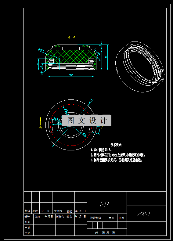 本设计是以“水杯盖塑料注塑模具设计”为主题。其设计思路由参考多个生产事例而得出,设计内容是从零件的工艺分析开始的,根据工艺要求来确定设计的大体思路。在设计当中,很多东西都是自己原来所没有接触过的,尤其是前段时间所学的理论课知识与现在的自己动手操作设计,设计顺序开始是从零件的材料选择,接下是成型参数、密度、收缩率的确定,模具种类与模具设计的关系、塑件的尺寸精度与结构、注射机的选择、模具设计有关尺寸的计算(包括模具型腔型芯的计算及其公差的确定)、注塑机参数的校核、模具结构设计、模具冷却、加热系统计算、注射模标准件的选用及总装技术要求等内容。 其次是模具的结构,在模具结构的设计当中,首先设计的是模具的型腔结构,接下来是型芯结构、斜导柱、滑块、导向机构、复位杆、拉料杆、推件杆和推出机构,这样做的目的是为了规范化,更重要的是为了以后与制造人员的配合。既让自己有了良好的设计习惯,又能锻炼自己的配合意识。为以后工作做一次演练,这样更能体现理论与实践相结合的目的。