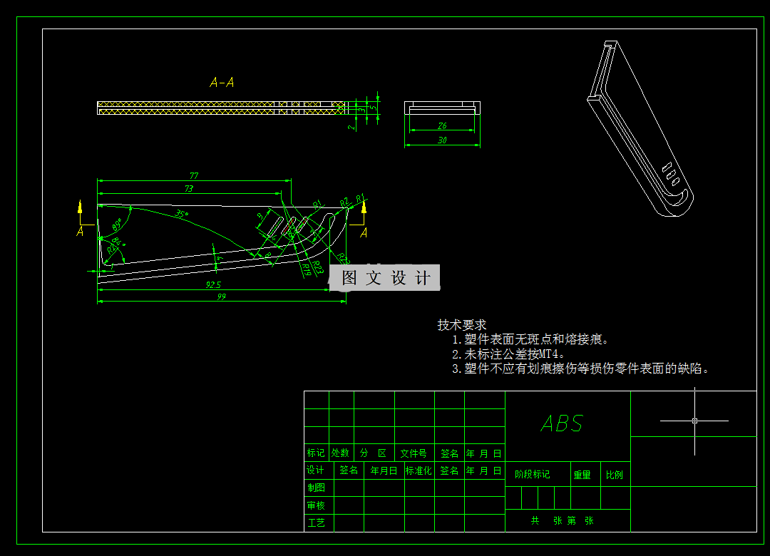 本设计是以“水果刀刀套注塑模具设计”为主题。其设计思路由参考多个生产事例而得出,设计内容是从零件的工艺分析开始的,根据工艺要求来确定设计的大体思路。在设计当中,很多东西都是自己原来所没有接触过的,尤其是前段时间所学的理论课知识与现在的自己动手操作设计,设计顺序开始是从零件的材料选择,接下是成型参数、密度、收缩率的确定,模具种类与模具设计的关系、塑件的尺寸精度与结构、注射机的选择、模具设计有关尺寸的计算(包括模具型腔型芯的计算及其公差的确定)、注塑机参数的校核、模具结构设计、模具冷却、加热系统计算、注射模标准件的选用及总装技术要求等内容。 其次是模具的结构,在模具结构的设计当中,首先设计的是模具的型腔结构,接下来是型芯结构、斜导柱、滑块、导向机构、复位杆、拉料杆、推件杆和推出机构,这样做的目的是为了规范化,更重要的是为了以后与制造人员的配合。既让自己有了良好的设计习惯,又能锻炼自己的配合意识。为以后工作做一次演练,这样更能体现理论与实践相结合的目的。