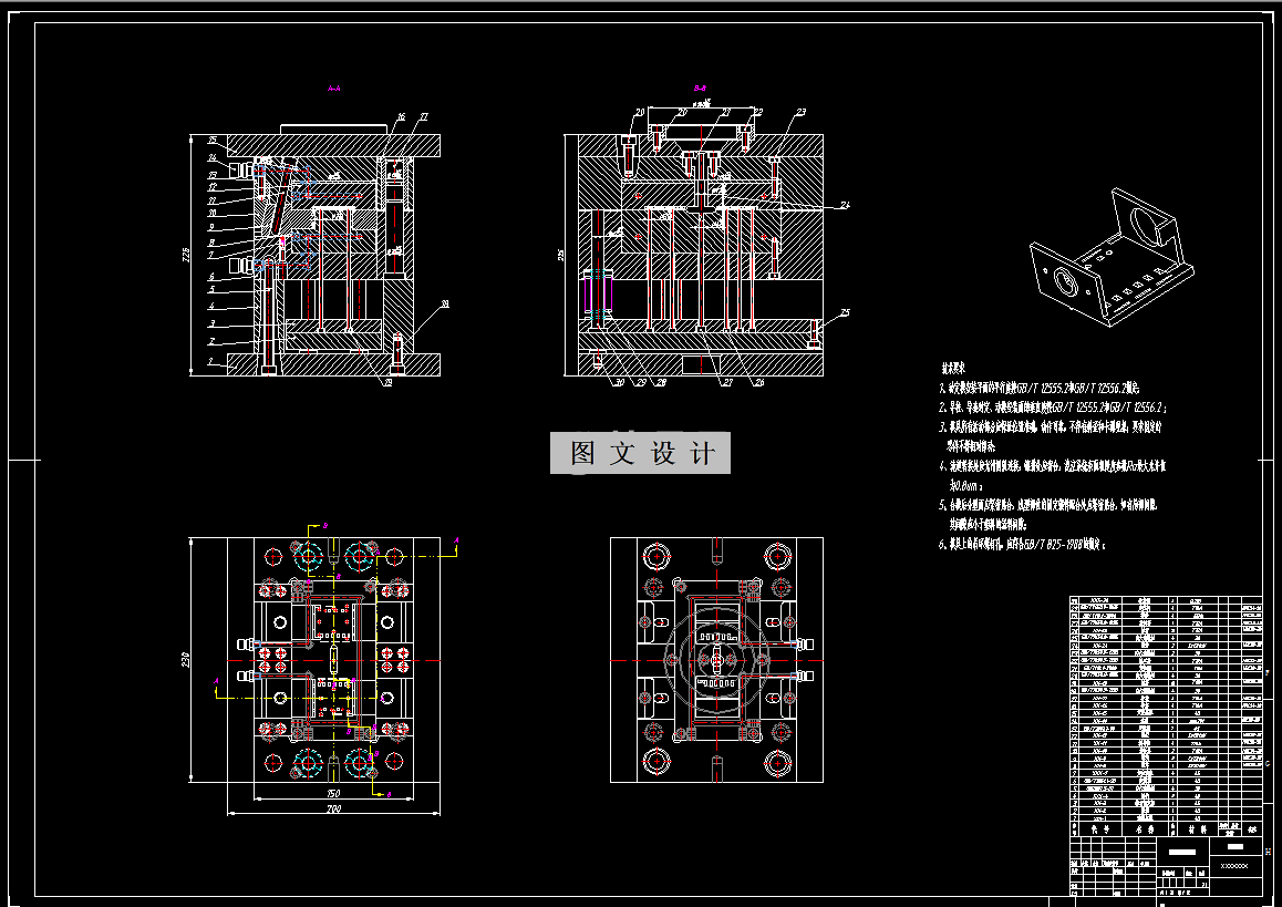 本设计是以“安装架注塑模具设计”为主题。其设计思路由参考多个生产事例而得出,设计内容是从零件的工艺分析开始的,根据工艺要求来确定设计的大体思路。在设计当中,很多东西都是自己原来所没有接触过的,尤其是前段时间所学的理论课知识与现在的自己动手操作设计,设计顺序开始是从零件的材料选择,接下是成型参数、密度、收缩率的确定,模具种类与模具设计的关系、塑件的尺寸精度与结构、注射机的选择、模具设计有关尺寸的计算(包括模具型腔型芯的计算及其公差的确定)、注塑机参数的校核、模具结构设计、模具冷却、加热系统计算、注射模标准件的选用及总装技术要求等内容。 其次是模具的结构,在模具结构的设计当中,首先设计的是模具的型腔结构,接下来是型芯结构、斜导柱、滑块、导向机构、复位杆、拉料杆、推件杆和推出机构,这样做的目的是为了规范化,更重要的是为了以后与制造人员的配合。既让自己有了良好的设计习惯,又能锻炼自己的配合意识。为以后工作做一次演练,这样更能体现理论与实践相结合的目的。