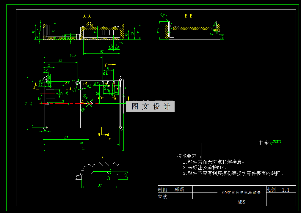 本设计是以“相机电池充电器上盖注塑模具设计”为主题。其设计思路由参考多个生产事例而得出,设计内容是从零件的工艺分析开始的,根据工艺要求来确定设计的大体思路。在设计当中,很多东西都是自己原来所没有接触过的,尤其是前段时间所学的理论课知识与现在的自己动手操作设计,设计顺序开始是从零件的材料选择,接下是成型参数、密度、收缩率的确定,模具种类与模具设计的关系、塑件的尺寸精度与结构、注射机的选择、模具设计有关尺寸的计算(包括模具型腔型芯的计算及其公差的确定)、注塑机参数的校核、模具结构设计、模具冷却、加热系统计算、注射模标准件的选用及总装技术要求等内容。 其次是模具的结构,在模具结构的设计当中,首先设计的是模具的型腔结构,接下来是型芯结构、斜导柱、滑块、导向机构、复位杆、拉料杆、推件杆和推出机构,这样做的目的是为了规范化,更重要的是为了以后与制造人员的配合。既让自己有了良好的设计习惯,又能锻炼自己的配合意识。为以后工作做一次演练,这样更能体现理论与实践相结合的目的。