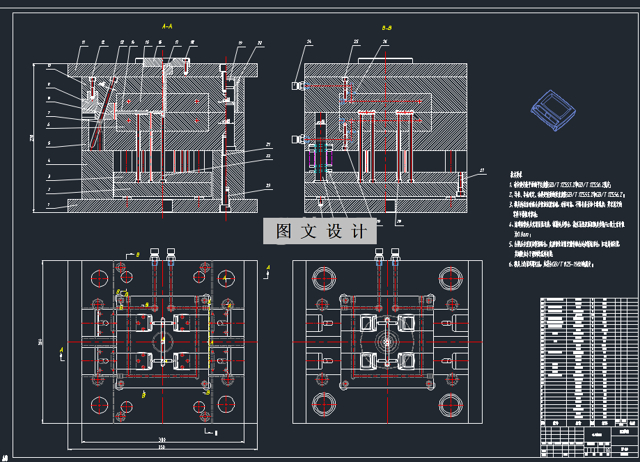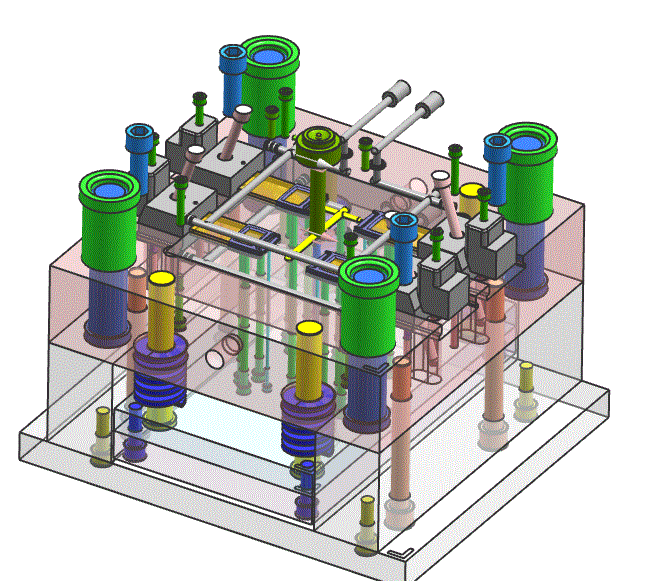 本次设计型腔数目为一模四腔的结构,采用了最常用的侧浇口进胶的方式,通过三维软件获得了产品体积,并对本次模具选定了型号注塑机及龙记标准CI模架型号。确定了模具最佳分型面位置,然后对主要的模具结构比如浇注系统、脱模机构、模具冷却系统进行详细的设计及计算。在成型零部件设计时,对成型零件的结构形式做出了选择并对成型零件的成型尺寸进行计算。最后对所选注塑机型号进行了校核。