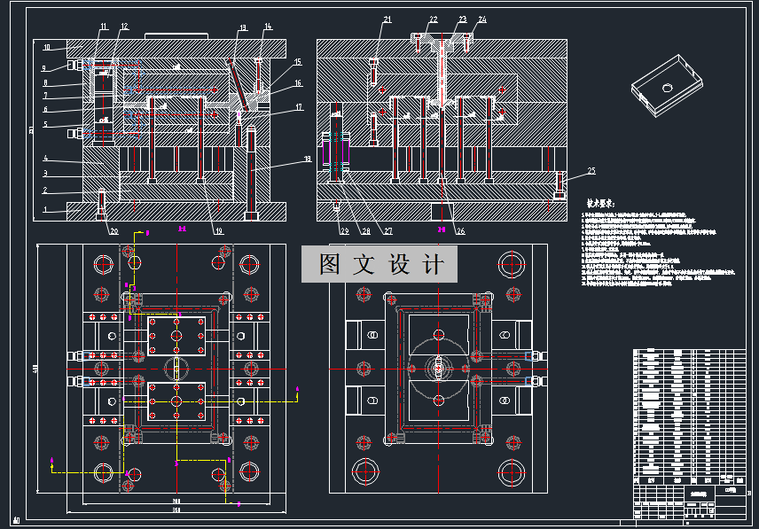 本文研究的是盒盖的注塑成型模具设计。在本次模具设计中首先绘制出某盒盖三维图并导出了产品零件图,通过分析它结构复杂以及精度来设计合理的模具方案,接着对产品的塑料原材料进行了选择并做出分析,初选了注塑机型号为XS-ZY-125。型腔数目决定采用一模两腔结构,型腔排布采用一字型排列方式,本次设计分型面位置进在了产品底面处,由于产品表面要求不高,所以选择了侧浇口类型,注塑机选用HTF90注塑机,所选模架型号为CI型框架。本次设计的脱模机构选择了推杆推出方式。然后为本次塑料模具设计设计一套模具冷却系统。最后对注塑机主要参数进行了校核。最后根据以上所设计的内容,通过所掌握的二维和三维软件完成了模具装配图、模具三维装配体以及模具零件图绘制。