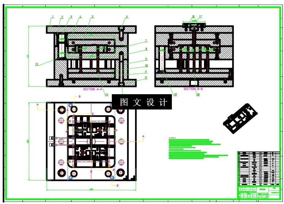 数码产品内部结构件塑件采用的材料为ABS,ABS的使用性能好,强度高,尺寸稳定;成型工艺性能高,耐化学性、易成型。同时考虑到实际的生产需要,在保证成型塑件质量的前提下,尽量降低成本,因此模具采用一模2件,侧浇口进料,注射机选用卧式注射机,有合理的排气系统和冷却系统。在模具设计的过程中,采用了UG三维造型,AutoCAD绘制总装图及各成型零件图,并编制型芯,型腔等零件的机加工工艺。