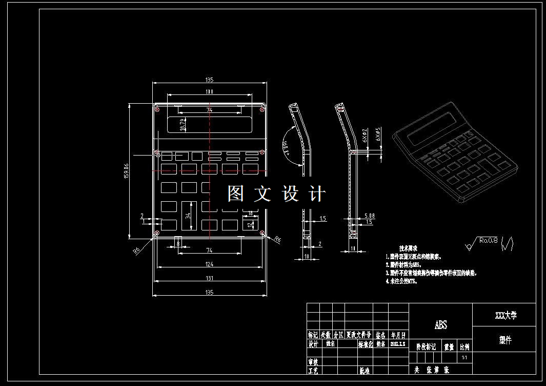 本文主要研究设计生产计算器盒盖的注塑模具结构的相关设计。在对现有的计算器盒盖进行工艺分析、完成了计算器盒盖材料选择,材料选用ABS。采用了UG和CAD软件绘制了计算器盒盖的三维立体图及零件图。设计了该计算器盒盖的注塑模具,模具采用一模两腔,浇口采用侧浇口,注塑机选用HTF300J/TJ注塑机,所选模架型号为CI型框架。完成了该注塑模具装配图,完成了型芯,型腔,分型面,侧抽芯,浇口,定模座板,动模座板等非标准件的零件图。设计完成了该模具的推出机构,冷却、排气系统。