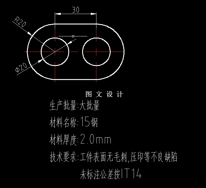 本次是托板零件制件的复合模具设计,制件设计使用的材质是15钢。托板零件的外形是对称的,板厚度为2.0mm, 托板零件为落料、冲孔件,上面有两个圆孔。所以托板零件可以采用常用的复合冲裁模。根据所给的任务书中的零件和基本参数,参考相关冲孔模的资料,确定托板零件冲压模的加工工艺过程,确定工序方案。计算冲孔模各部分工艺力尺寸,如冲孔力、卸料力和总冲压力,设计托板零件冲压模的排样图,利用CAD确定压力中心位置。计算冲孔凸模、凹模刃口的尺寸,并考虑刃口需要的性能要求。分析设计模具结构,如模架结构,导向零件,定位零件,卸料零件,选择合适的冲压设备,校核压力设备。最后绘画各零件简图和装配图,确定各个零件的加工方法。