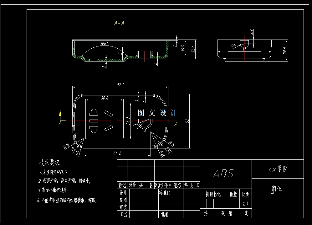 本文重点讨论和研究了插座外壳的注塑模具设计,本文主要对成型插座外壳模具方案各个机构方案进行了详细的研究与设计,首先分析了插座外壳工艺结构,综合材料所需性能并对ABS材料选择,然后选取了分型面的位置并确定型腔数目设计了H型排布方式,对模具的浇注系统、脱模机构、模具冷却以及排气系统都做了相应的设计。本次模具设计所选注塑机型号为海天HTF86/TJ,对注塑机主要参数进行了校核。由于此次模具采用了侧浇口的浇口类型,所以为模具选择CI龙记大水口两板标准模架。