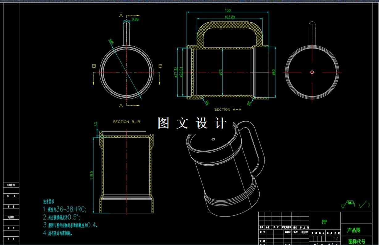 本次设计主题是针对水杯塑件产品设计制造一套完成注塑加工生产所用的注射模具。首先研究分析水杯塑件产品的零件图纸,采用计算机三维绘图软件构建水杯塑件产品的三维模型,以此为研究分析基础,同时结合水杯塑件产品具体的结构形态及其成型加工批量等具体要求,完成水杯塑件产品的选材设计,综合相关设计因素,最终确定选用PP材料注射成型加工该水杯塑件产品。