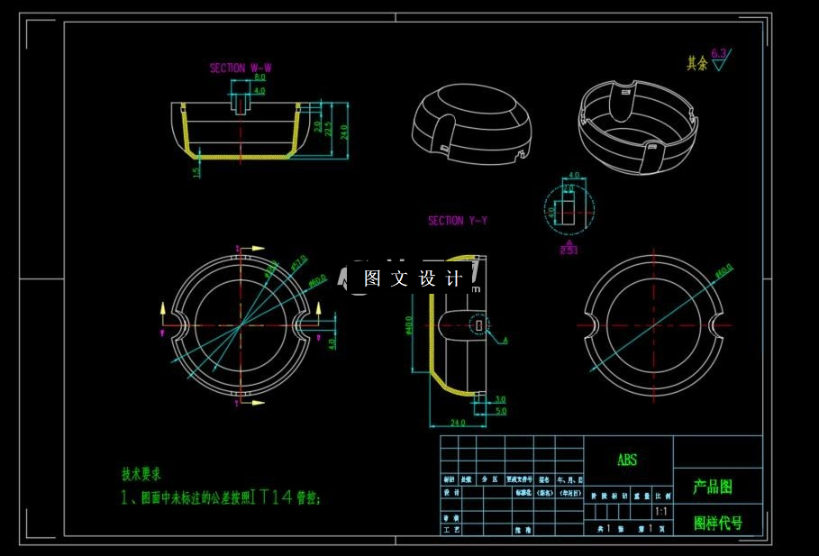 根据塑料制品的要求,采用注塑模具设计完成。同时了解塑件的用途,分析塑件的工艺性、尺寸精度等技术要求,考量塑件制件尺寸。本模具采用一模四腔,潜伏式浇口进料,注射机采用HTF120J/TJ型号,设置冷却系统,CAD和UG绘制二维总装图和零件图。选择模具合理的加工方法。附上说明书,系统地运用简要的文字,简明的示意图和和计算等分析塑件,从而作出合理的模具设计。