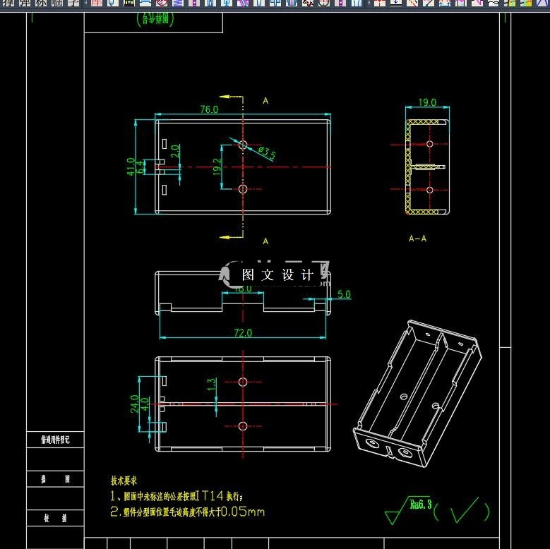 本次设计的产品为电池组盒,具有重量轻,强度高,耐腐蚀,易清洁等 特点,为大批量生产产品。本次设计在针对产品进行工艺性分析后,确定模具分 型面、 型腔数目、 浇口形式、 位置大小; 其中最重要的是确定型芯和型腔的结构, 以及它们的定位和紧固方式。此外还进行了脱模机构的设计,合模导向机构的设 计,冷却系统的设计等。最后绘制完整的模具装配总图和主要的模具零件图及编 制成型零部件的制造加工工艺过程卡片。