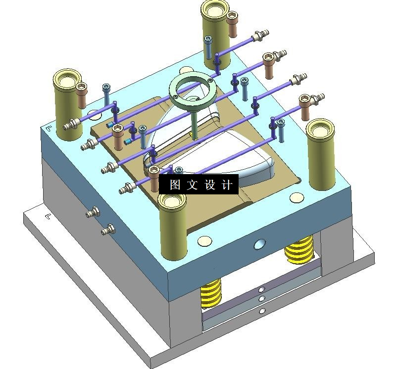 分析完产品本身以后首先需确定该产品的分型面,这一步至关重要,通常采用产品最大端面处为分型面。然后再用UG测量出该产品的最大尺寸多少,结合实际确定出一模几腔满足实际加工要求,经过综合分析为一模两腔的型腔布局,布局规则和均匀,然后选择合适的模架即可。流道尽可能的设计在塑件中间,保证其良好的充填性,本次采用直接浇口转侧浇口。本次设计的产品难度和结构一般,就利用分型面自然排气,不用单独设计排气系统。再者,水道也要设计得均匀的冷却产品,不可离流道太近,再者就是水道和产品距离需要大于5mm。本次设计顶杆分布均匀顶出塑件,可以在塑件脱模之后的质量得到保证。设计完了以后就对模具进行参数校核,然后确定各个结构之间配合是否符合设计要求,对比,不符合要求的微作调整。然后检查完成以后就导出二维图在CAD里面进行标注,整理图档。