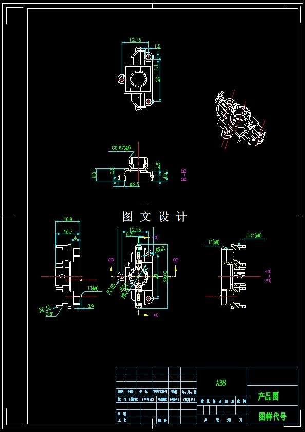 塑件的材料采用ABS,属热塑性塑料。从使用性能上看,ABS是吸水小,耐寒性较好.采用一模两腔的模具结构,考虑其外形尺寸,注塑时所需压力和工厂现有设备等情况,初步选用注塑机XS—ZY—125型。
