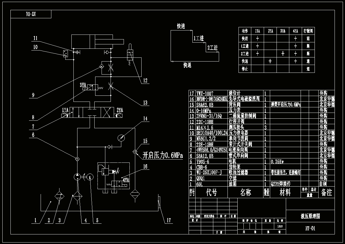 技术参数:钻床工作头工作循环为:快进→一级工进→二级工进→快退→停止。钻头为垂直放置,液压系统的主要参数与性能要求为:切削轴向力Ft=720N;移动部件总重力G=100N;快进行程L1=120mm;一级工进行程L2=200mm;二级工进行程L3=120mm;快进速度为V1=6.0m/min;一级工进速度为V2=0.9m/min;二级工进速度为V3=0.4m/min;快退速度为V4=6m/min;加速时间和减速时间均为0.2s。该钻头可在任意位置停止。