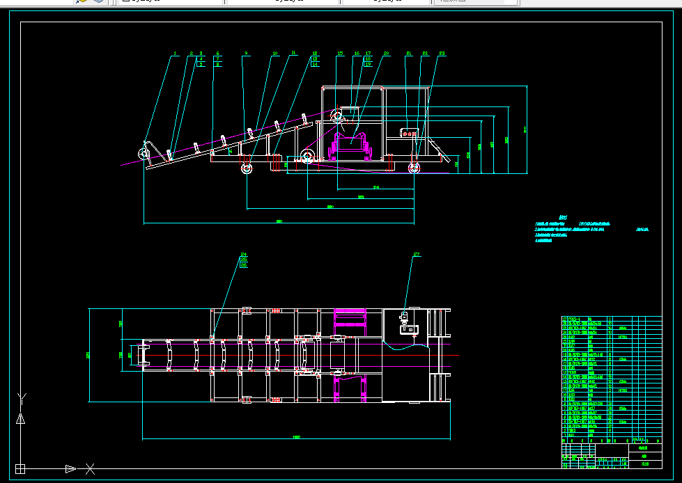 卸料车装有两个改向滚筒,利用车轮可以在输送机机架两边铺设的导轨上行走。输送带的承载段绕过滚筒时,将物料卸到安在小车上的漏斗中。小车的行走是由电动机通过减速器和链轮带动车轮来实现的。