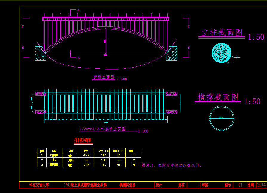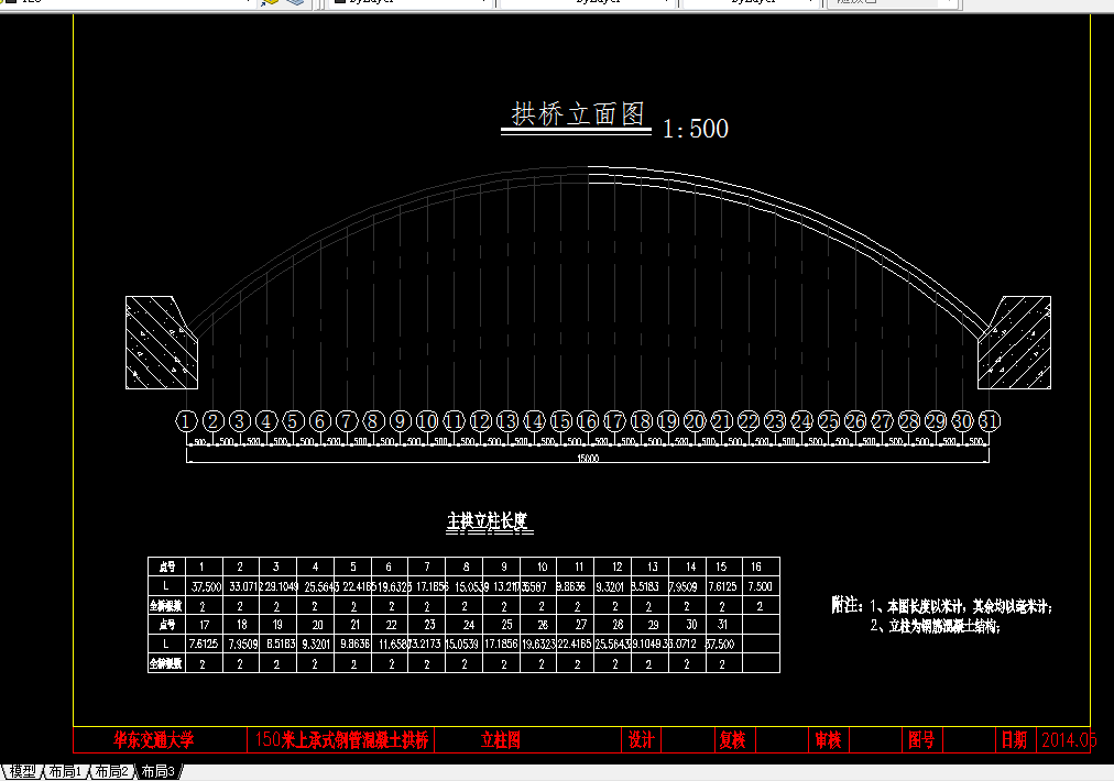 本次设计选用的是上承式钢管混凝土拱桥,拱轴线为悬链线,跨径为150米,矢跨比为五分之一,桥面为双向六车道+2米人行道,公路等级为一级。