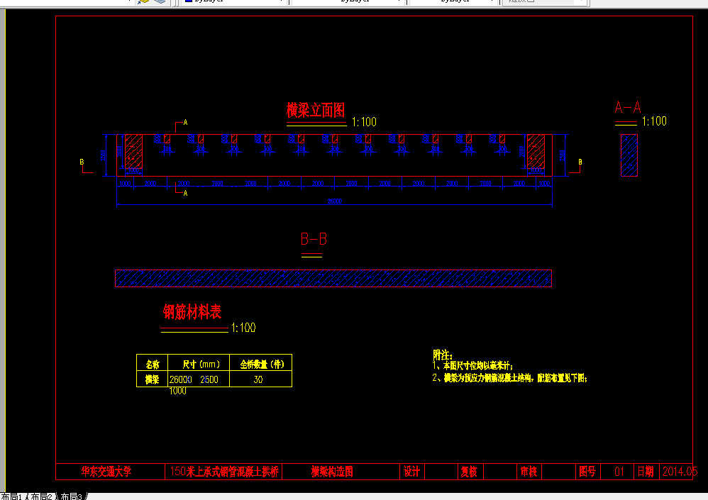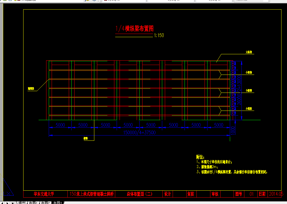 (4)横梁计算中,运用刚性横梁法计算,确定计算荷载,绘制横梁内力影响线,内力组合,配筋计算,截面验算;