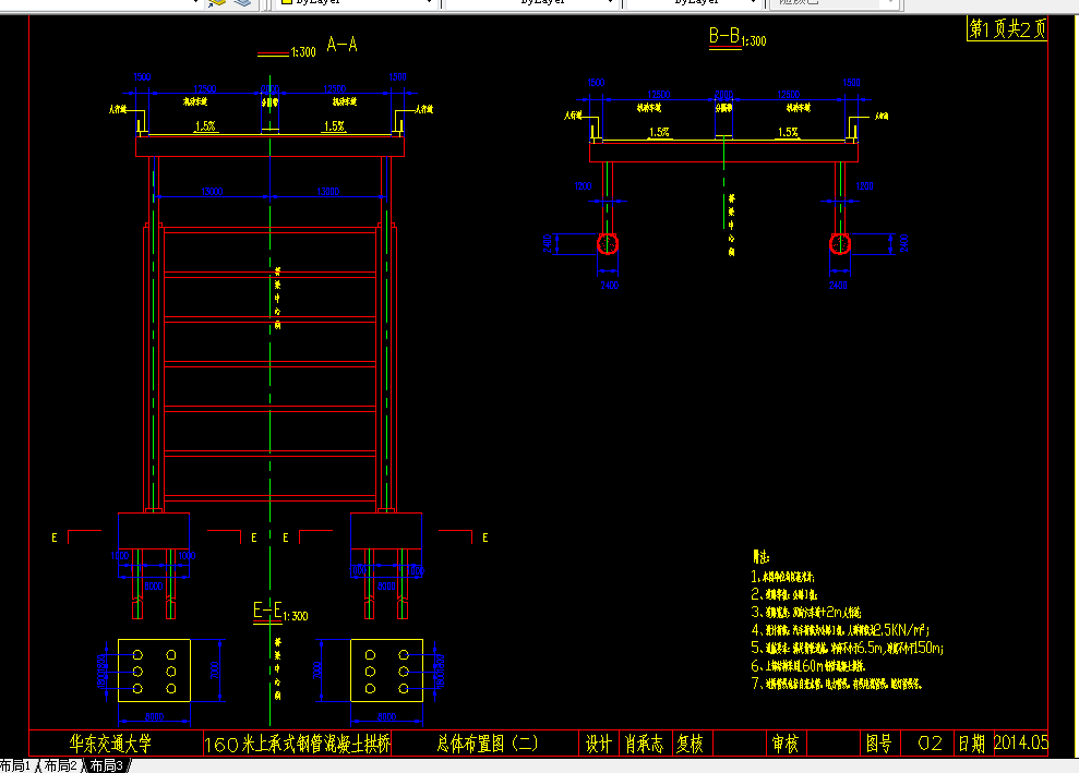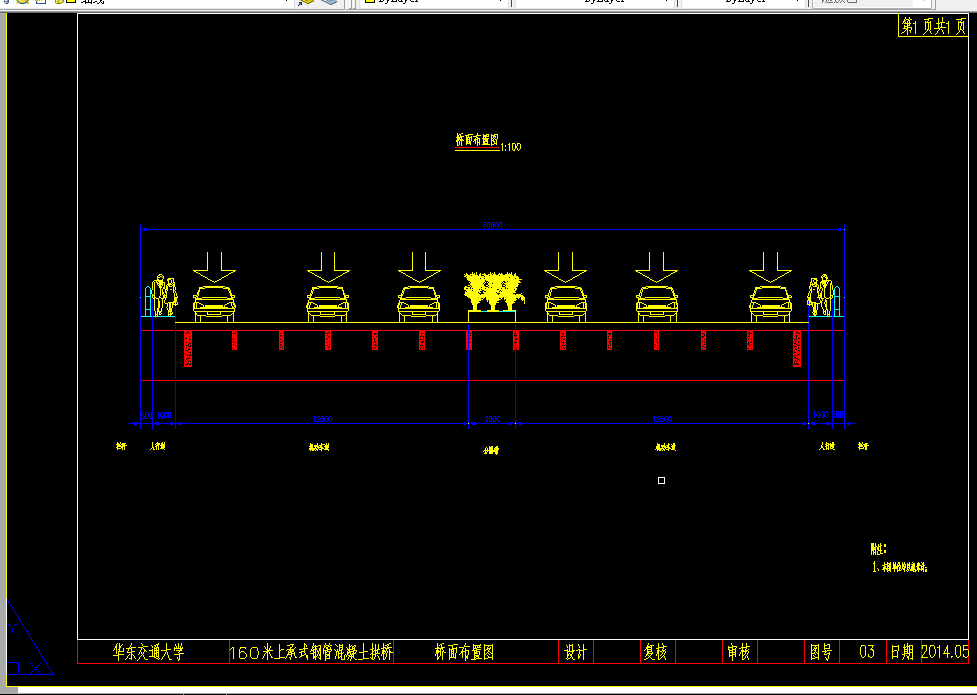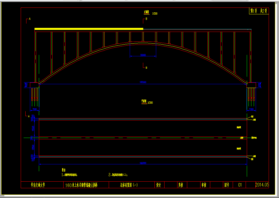 本次设计为160米跨上承式钢管混凝土拱桥,矢跨比为五分之一,桥面宽为双向六车道+2米人行道。