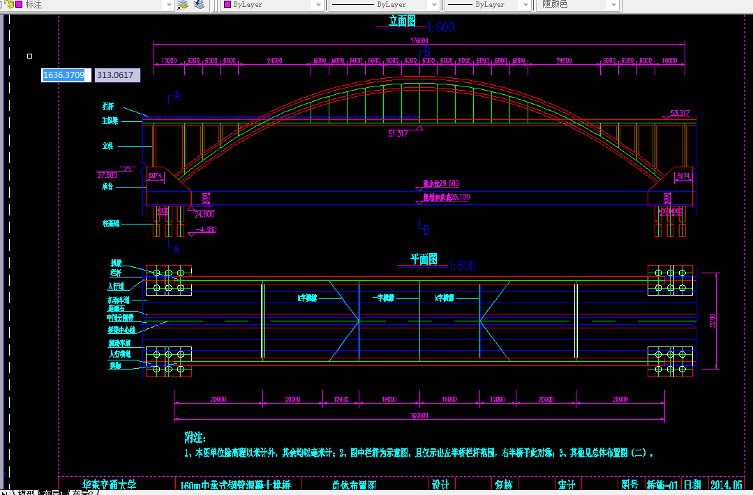 本设计根据任务书要求设计一跨径160m中承式钢管混凝土悬索线拱桥,矢跨比为1/5,拱轴截面采用等截面。