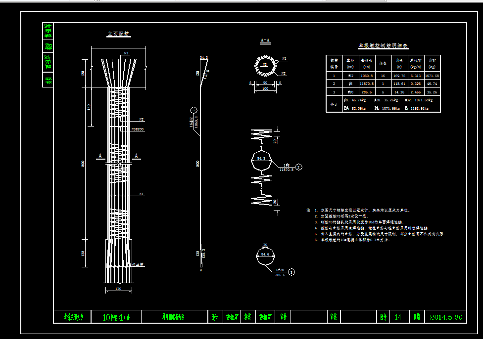 本次毕业设计是一座3×30m预应力混凝土先简支后连续梁桥设计,设计的内容主要包括上部结构设计和下部结构设计两大部分。其一般设计步骤是先进行桥型方案比选选出最优桥型方案,然后依据设计资料和相关设计规范初步确定箱梁的尺寸并检验其截面效率指标,再利用桥梁博士建立力学模型并进行恒载和活载内力计算及组合,初步估算出所需要的预应力筋数量并对钢束进行布置,然后配置普通钢筋,通过调束模块使构件各部分变形及应力验算满足要求并创建报告,再从桥梁博士中导出各计算结果,经相关软件处理好写入草稿,依据设计资料和相关设计规范对横隔梁进行配筋和验算,再利用CAD绘图软件绘制出上部结构各部分图纸。下部结构的设计包过盖梁计算和桥墩配筋计算,严格依据设计资料和相关设计规范进行手算。
