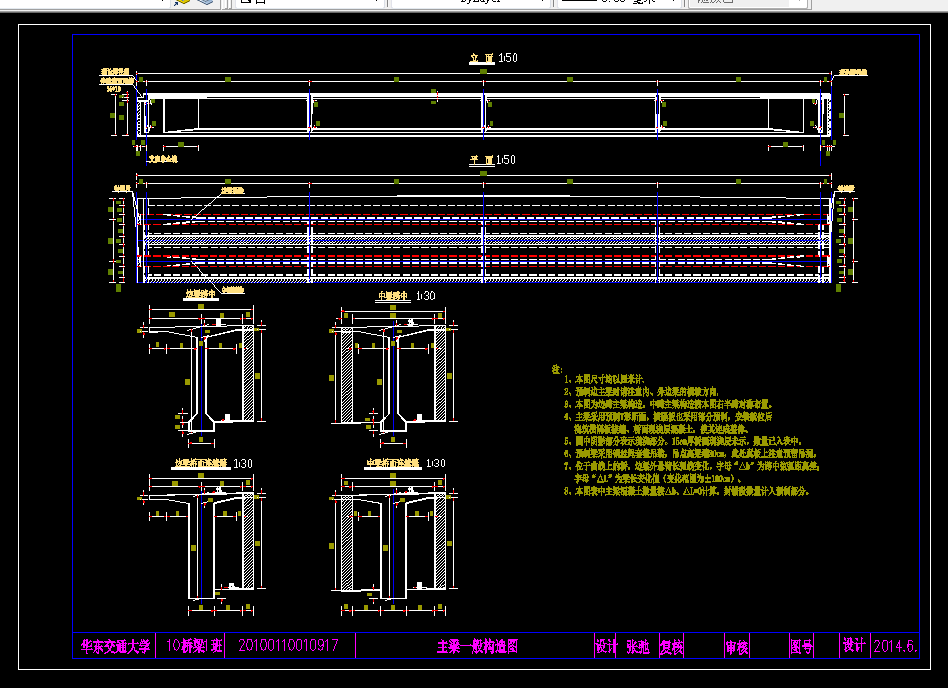 本设计综合比较选择5*40m预应力混凝土先简支后连续T梁设计。先根据 桥梁设计的一般方法在三种方案中进行了桥梁方案比选,确 定桥梁设计方案,初步拟定桥梁细部尺寸。再利用专业软件桥梁博士建立简化模型,进行全桥成桥阶段和施工阶段进行受力分析,完成预应力钢束的估束和配束,并对预应力钢束进行预应力损失计算。对桥梁下部结构设计,包括桥梁盖梁计算,桥墩配筋计算。将钢束信息输入桥梁博士后利用桥梁博士,对桥梁进行持久状况的承载能力极限验算、正常使用极限抗裂验算、持久状况应力验算和短暂状况应力验算、桥梁整体刚度验算,并且调节钢束参数使得各项验算满足规范要求。经过设计计算、分析比较证明该桥设计方案合理,设计方法正确,内力分布合理,综合分析该设计符合桥梁设计各项规范要求。