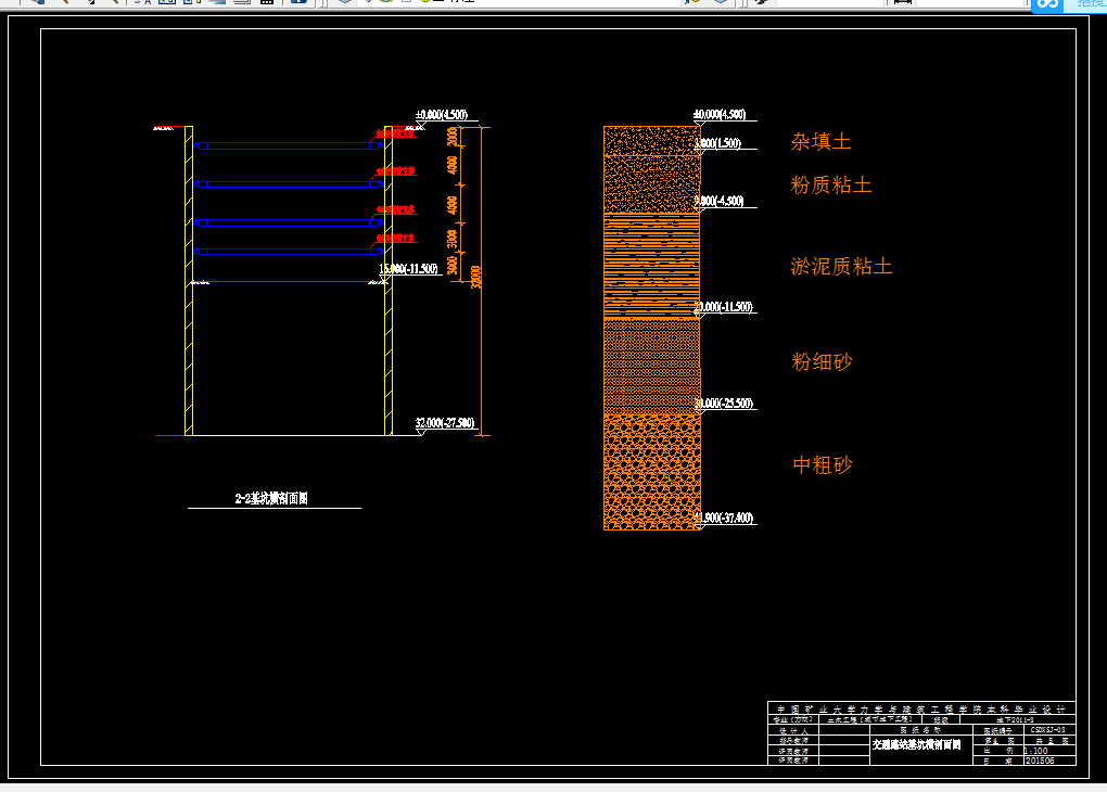 在第一部分基坑围护结构设计中,根据基坑穿越地层的工程地质、水文地质条件和周边环境情况,通过施工方案的比选,确定围护结构采用地下连续墙,支撑体系采用钢结构,并对其进行相应的强度和稳定验算。