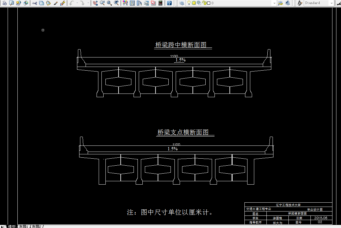此次设计的题目为镇雄南大桥上部设计,本桥设计车速为100Km/h,跨径为35m,采用分离式共四跨等跨的预应力混凝土T型简支梁桥,单幅桥宽为11m,主梁为变截面T型梁。跨中、支点梁高均为2.3m