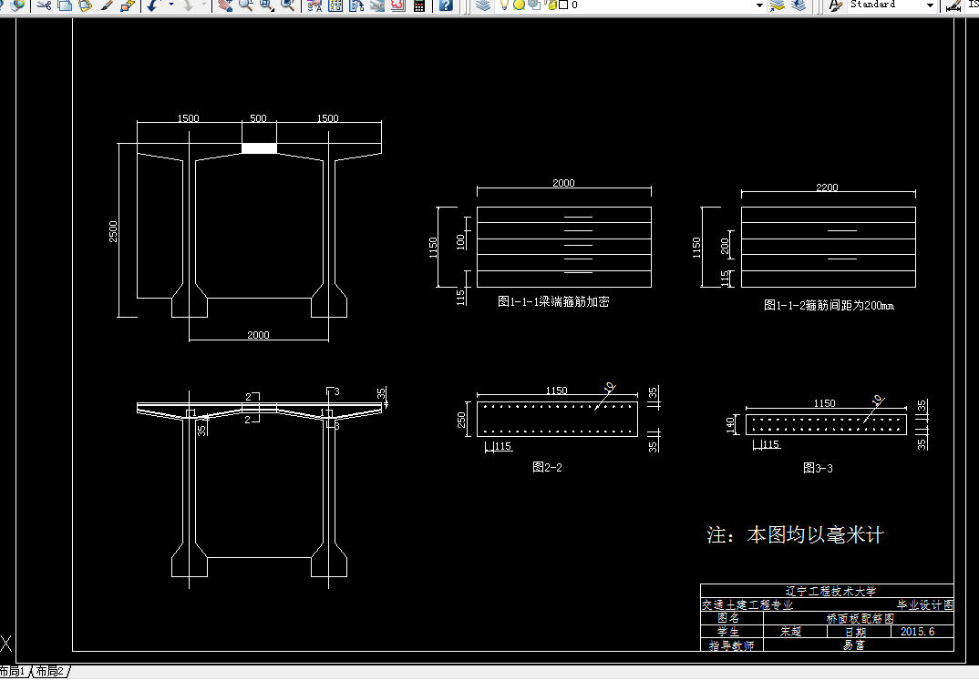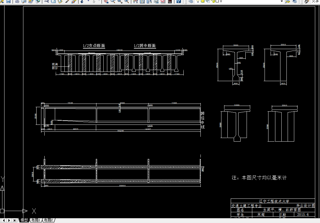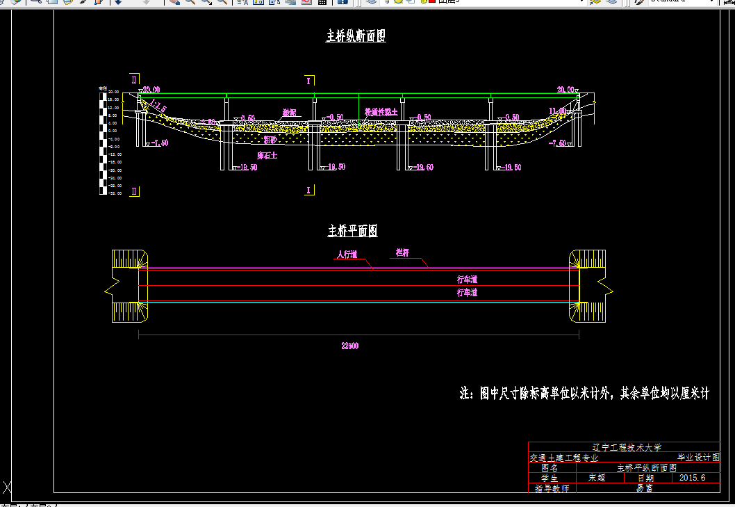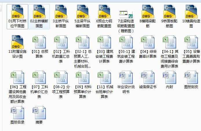 本次毕业设计题目为两下村大桥上部结构设计,本桥为5跨预应力混凝土简支T形梁桥,全长225m。本设计旨在综合大学所学的各科专业知识,促进我们对所学知识内容的融会贯通,激励我们对缺漏之处的填补,形成知识体系框架,对桥梁上部的设计能够具体的掌握。