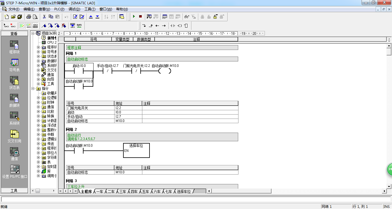 本设计是基于PLC的升降横移立体库的设计,设计一个基于西门子S7-200 PLC控制核心的,三层三列,九个车位的立体停车控制系统。通过分析控制工艺 的要求,设计了主电路图和控制电路,分配了PLC输入和输出点,设计PLC接线图,编制程序了流程图,使用编程软件编写梯形图和语句表控制程序,最后使用组态王进行了模拟仿真演示。