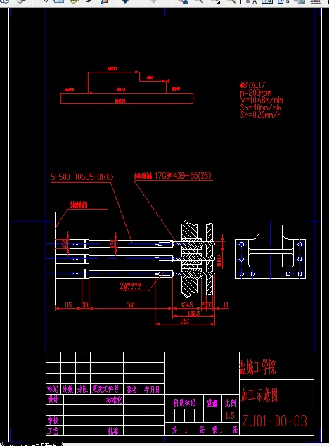 摘要:“Y”型支架双面钻孔组合机床加工的是支架零件。主要钻削加工支架上的18-φ17和8-φ17孔。该零件形状独特,因此对工件的定位和夹紧比较困难。本设计任务是在完成组合机床总体设计的基础上,完成前主轴箱的设计。首先分析了所要加工工件的特点,进行了组合机床的总体设计,绘制了被加工零件的工序图、加工示意图、机床联系尺寸图和生产率计算卡,在此基础上,进行了前主轴箱的设计。主要绘制了前主轴箱设计的原始依据图,拟订了主轴箱的传动路线等,然后绘制了主轴箱的装配图和一些零件图,校核了轴、齿轮等零件。设计过程中尽量使用了标准零部件,设计出的组合机床机构简单,操作方便,加工精度高,减轻了劳动强度,提高了加工效率,具有较好的经济性。