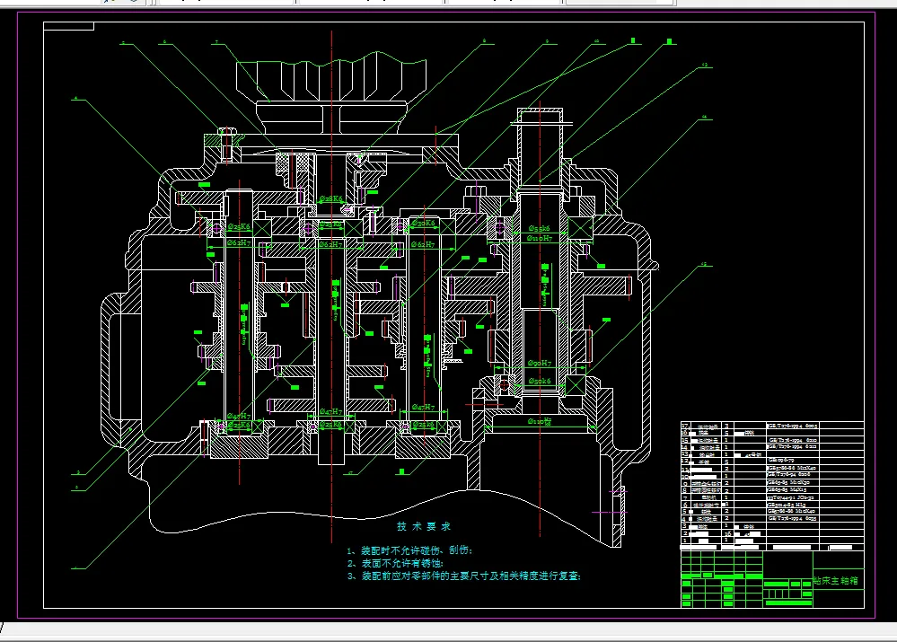 (3)、组合机床部件设计 包括专用多轴箱的设计,传动布局合理,轴与齿轮之间不发生干涉,保证传动的平稳性和精确性。专用主轴设计、轴承的选用及电机的选择等。