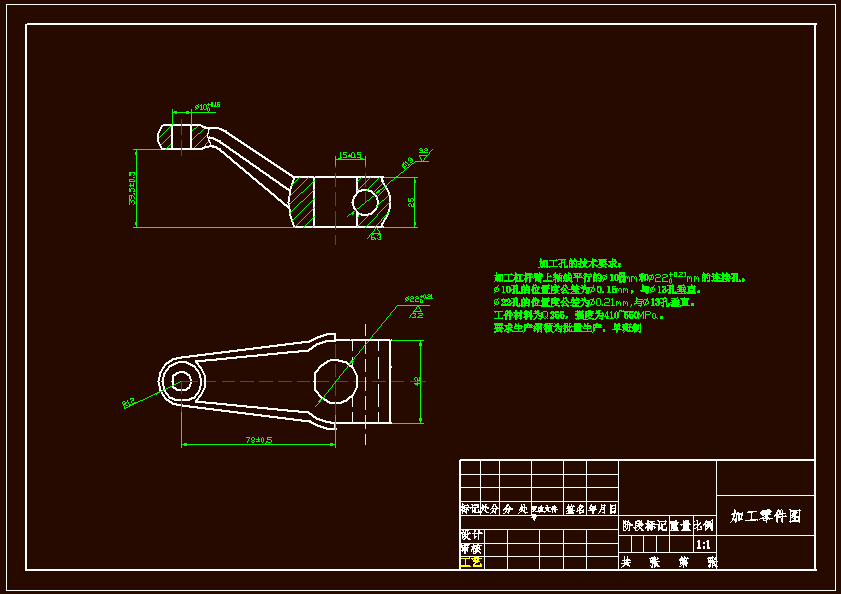 杠杆臂组合机床夹具设计本设计的零件为杠杆零件,选用Q255号钢。根据零件的形状、尺寸精度、生产的经济效益等各方面的详细分析其加工工艺,多采用钻床加工。通过对零件的分析,此工件外形轮廓尺寸小,重量轻,加工要求不高,批量生产。夹具的设计是不可缺少的一部分,它关系到能否提高其加工效率的问题。因此在保证质量和提高生产率的前提下,尽量简化结构,做到经济合理。夹具和机床的部分部件有着及其密切的联系。因此,要求组合夹具夹紧装置具有良好的刚性和足够的夹紧力,以保证在整个加工过程中工件不产生位移。同时,满足工件加工的各项技术要求,要保证工件不允许的变形,提高生产率和降低生产成本,工艺性和实用性要好。