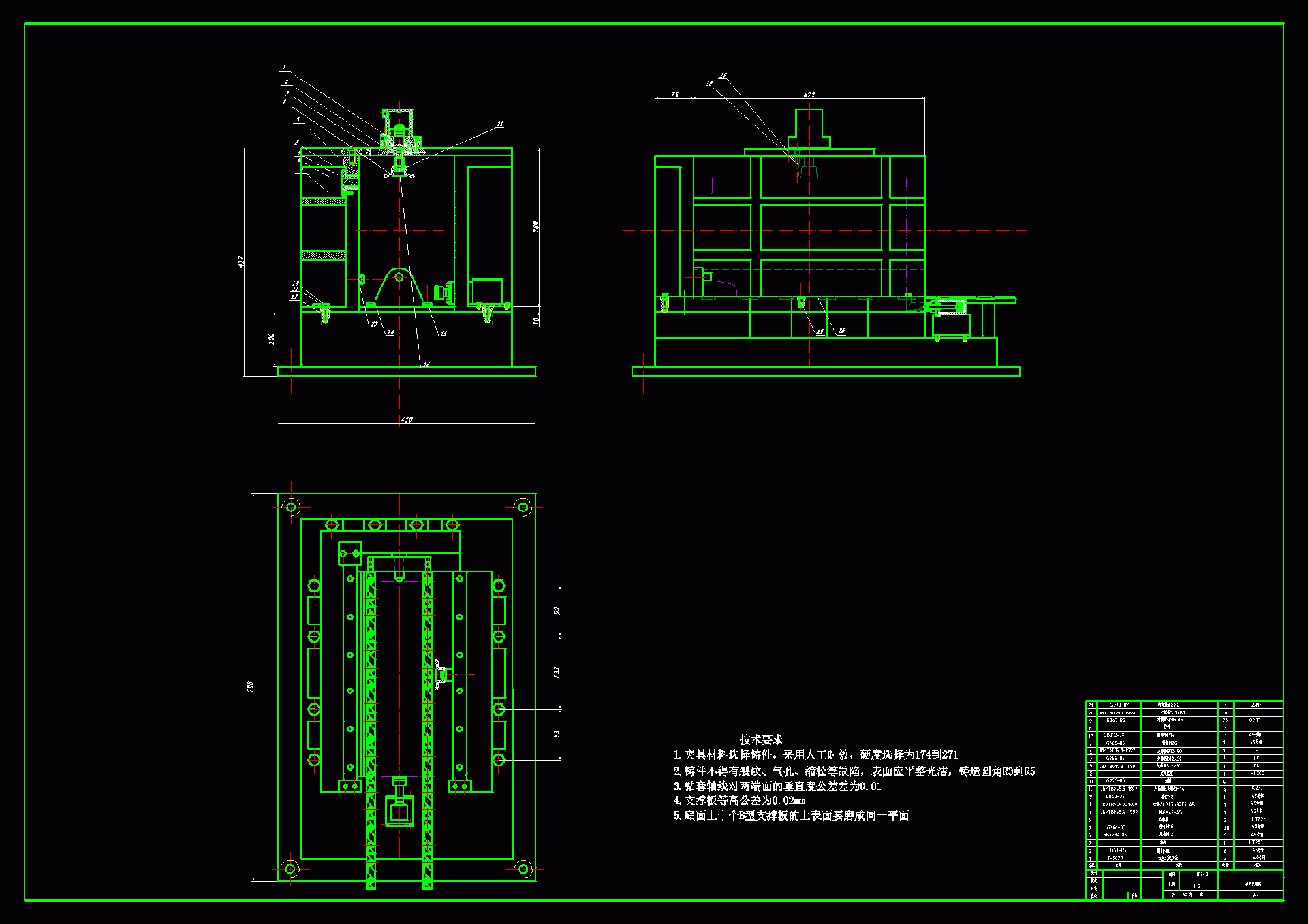 S1105柴油机箱体制造工艺规程及专用钻床设计 本次设计任务是S1105柴油机箱体制造工艺规程及专用钻床设计,主要内容是:首先对箱体零件工艺设计,在分析了S1105柴油机箱体的具体结构及加工技术要求的基础上,通过批量生产的分析确定箱体各部位的加工方案,并找寻最适合的工艺方案。根据每道工序的技术要求,选定每道工序的背吃刀量、进给量、切削速度以及所采用的机床、刀具、夹具等,确定每道工序的时间,从而绘制工艺过程卡片。然后是对专用钻床夹具体进行设计,根据被加工零件的结构特点、加工尺寸和精度要求,确定组合钻床的配置方案,对专机进行总体设计即三图一卡的设计,三图一卡包括零件工序图、加工示意图、机床联系尺寸图和机床生产率计算卡。其次绘制其装配图和相关的零件图。 整个加工过程均选用组合机床,夹具选用专用夹具,夹紧方式一般都选用液压夹紧,夹紧方式可靠。因此生产效率比较高。适用于大批量、流水线生产加工。能够满足设计的要求。