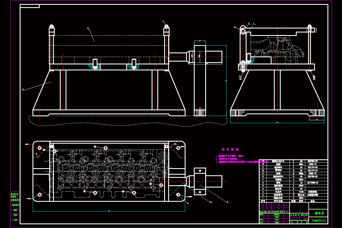 (2)、组合机床的总体设计确定机床各部件之间的相互关系,选择通用部件和刀具的导向,计算切削用量及机床生产效率、绘制机床的尺寸联系图及加工示意图。